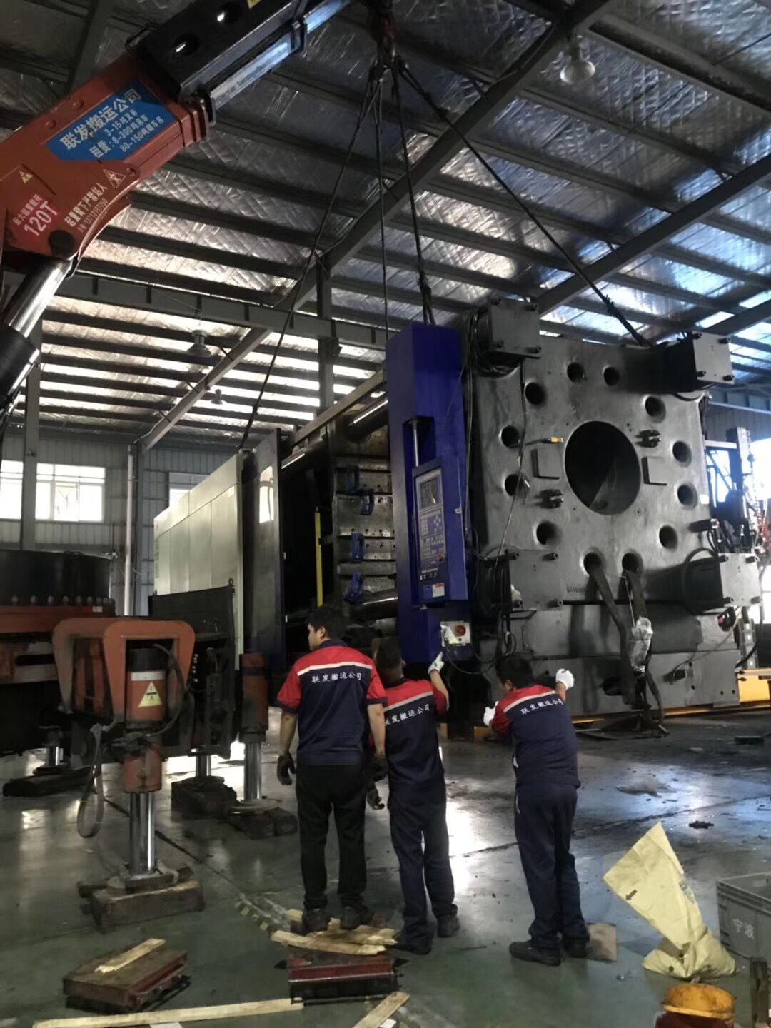 该海天塑机有1600吨之重,搬运时需要借助起吊机的力量,将其直接搬运至卡车上然后进行固定运动。